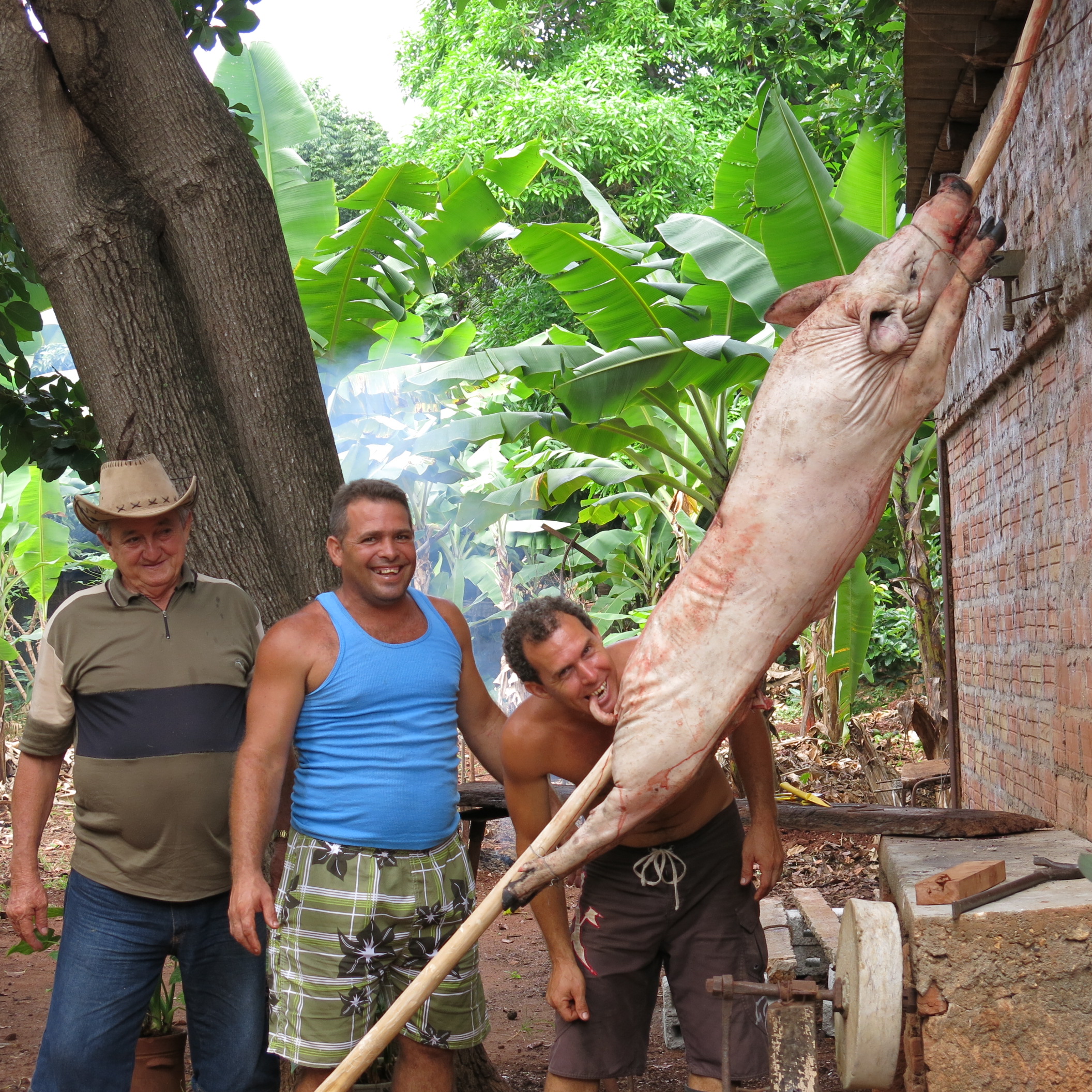 A member of the musical family was getting married the following week, to a Mexican girl he met over the phone (Cuban don’t engage in internet dating yet because few have access to computers), and we offered up our garden for the wedding feast afterward. A huge pig was cooked over an open fire, which took all day and Osiel and I provided lots of guacamole, fresh lemonade and mojitos whilst the guests chatted, sang and got acquainted with the bride and her Mexican girlfriend/bridesmaid. The children spent most of the day playing in the pile of sand and pebbles we have in the front yard waiting to be converted into concrete. Perhaps, we thought afterward, there is another business in the offing: a wedding reception venue.